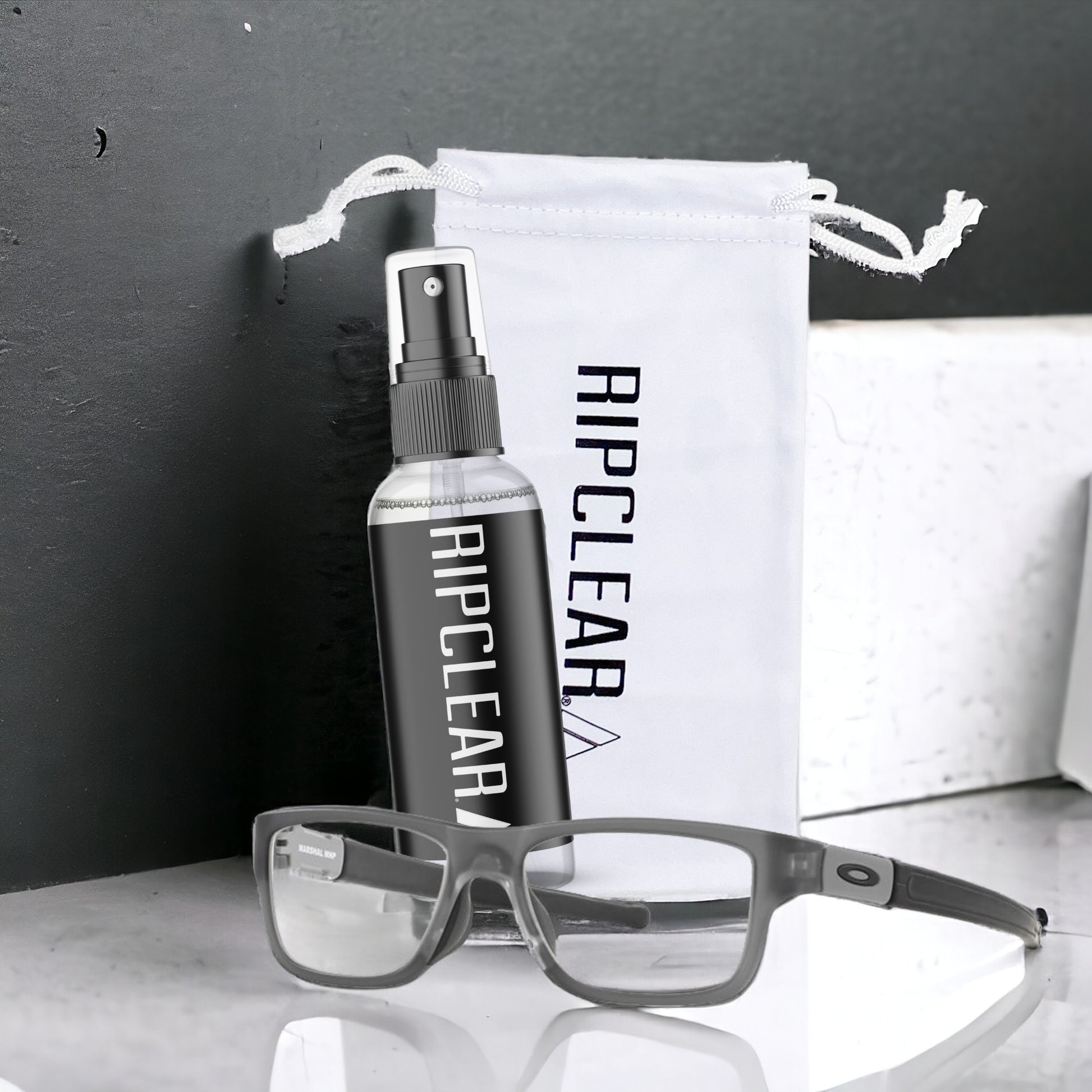 The Ripclear eyeglass cleaning kit is your one stop shop for pristine vision. The kit comes with a one ounce Ripclear eyeglasses cleaner spray, a bright white microfiber cleaning cloth, and a large microfiber drawstring case.